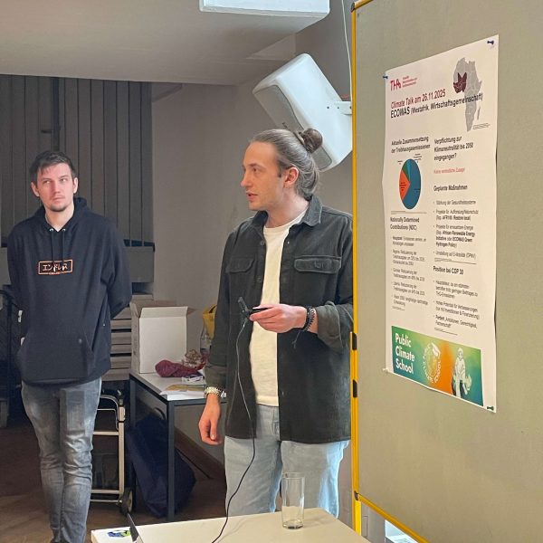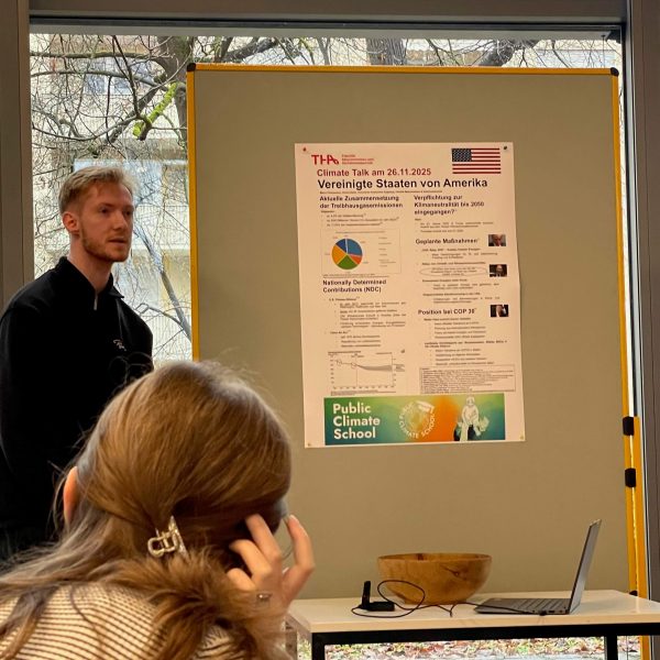 Zum Auftakt der Veranstaltung gab Verena Böhme den Anwesenden in einem kurzen Vortrag einen Überblick über die Ergebnisse der COP30 und vermittelte einen Eindruck über den Ablauf der internationalen Klimakonferenzen vor Ort. Mit einer Videoaufnahme wurde eine kurze Reflektion einer Teilnehmerin aus der argentinischen Delegation an der COP30 wiedergegeben. Im Anschluss an den Vortrag startete das Format Weltcafé. Bei einem Rundgang, präsentierten die Studenten des Masterstudiengangs ihre Poster zu den jeweiligen Länderpositionen bezüglich ihrer Klimapolitik und deren Ziele, darunter waren folgende Länder USA, EU, Deutschland, China, Russland sowie der Wirtschaftsverband der Westafrikanischen Länder (ECOWAS). In diesem Vergleich wurde deutlich, wie unterschiedlich die jeweiligen Zielsetzungen sowie die Wahl der Vergleichsjahre sind, die in den unterschiedlichen Staaten als Ausgangsjahr zum Vergleich der Emissionsreduktion gewählt wurden. Für einen Otto-Normal-Bürger sehr schwer verständlich, meinten die Studenten.
